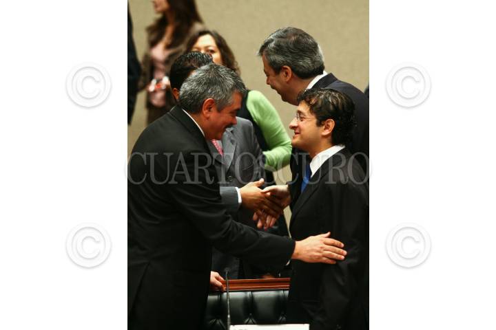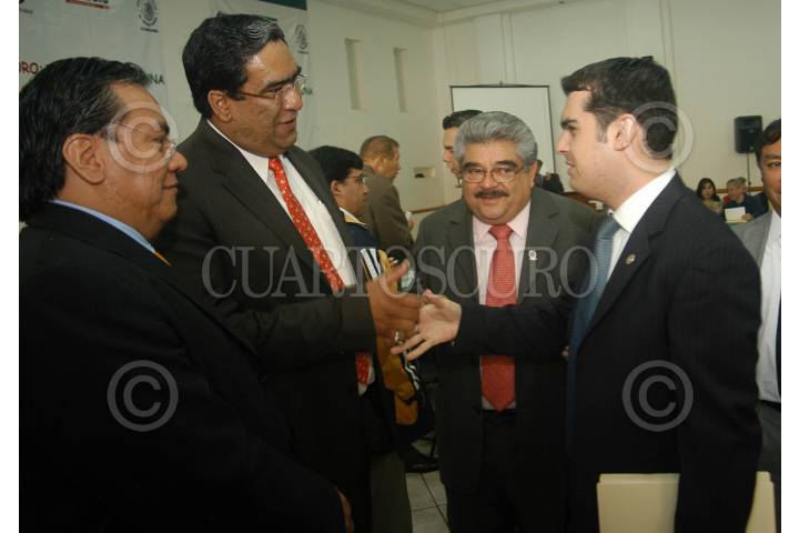 MÉXICO D.F. 19JUNIO2007.-Los diputados locales Isaias Villa Gónzalez del PRD Mauricio López Vázquez director de fundación Colosio del D.F. el cual es saludado por Jorge Triana del PAN y Jorge Shafino del PRI, durante su asistencia al foro "Temática para una Reforma Electoral" llevado acabo en las instalaciones del PRI capitalino. FOTO: GUILLERMO PEREA/CUARTOSCURO.COM