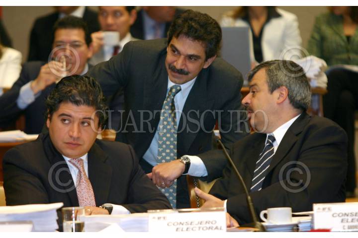 MÉXICO, D.F., 10JULIO2008.- El consejero Marco Antonio Baños Martínez, el diputado por Nueva Alianza Miguel Ángel Jiménez Godínez y el representante del PAN ante el IFE, Roberto Gil Zuarth, durante la sesión extraordinaria del Instituto. FOTO: ISAAC ESQUIVEL/CUARTOSCURO.COM