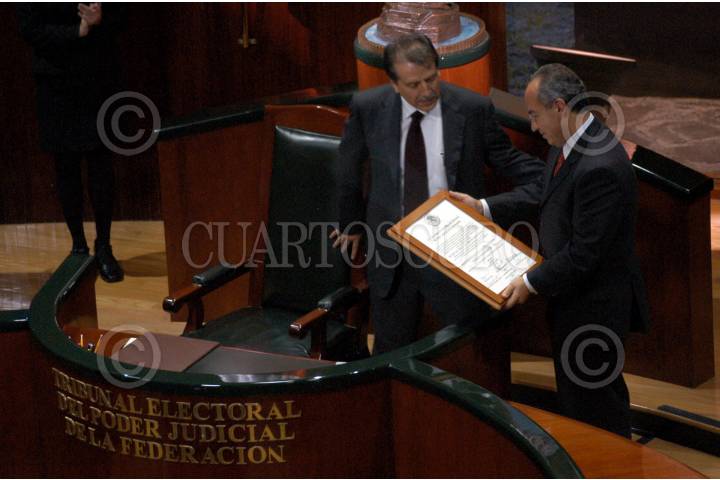 MÉXICO D.F. 06SEPTIMBRE.- Felipe Calderón, recibió de manos de magistrado del Tribunal Federal Electoral, Leonel Castillo González. la constancia de mayoría que lo avala como presidente elelcto de la republica. FOTO: GUILLERMO PEREA: CUARTOSCURO.COM
