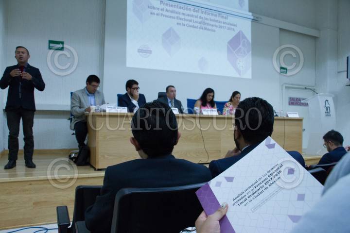 CIUDAD DE MÉXICO, 19MARZO2019.- Francisco Javier Aparicio Castillo, Integrante del COBAN 2018; Roberto Duque Roquero, Académico y Consultor; Yuri Beltrán Miranda, Consejera del Instituto Nacional de la Ciudad de México; Myriam Alarcon Reyes, Consejera del Instituto Nacional de la Ciudad de México y Claudia Zabala Pérez, Consejera del Instituto Nacional de la Ciudad de México en la sala Fernando Benítez de la Facultad de Ciencias Políticas y Sociales de la UNAM, durante el informe final sobre el análisis muestral de las boletas anuladas en el Proceso Electoral Local Ordinario 2017-2018 en la Ciudad. FOTO: ROGELIO MORALES /CUARTOSCURO.COM