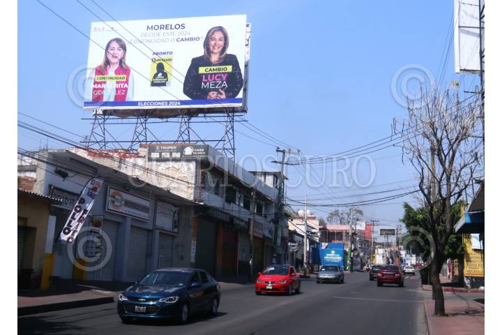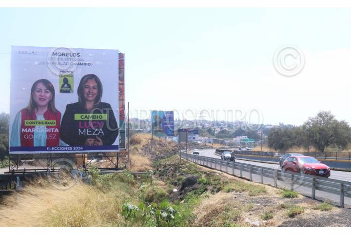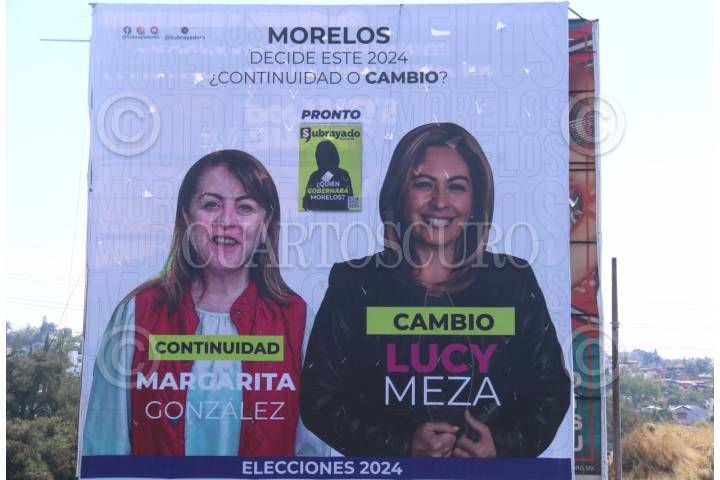 CUERNAVACA, MORELOS, 25FEBRERO2024.- Espectaculares colocados en todas las vías de comunicación del estado, donde se puede observar a las dos candidatas a la gubernatura, Margarita González Saravia, del Movimiento de Regeneración Nacional y Lucia Meza Guzmán del Frente Opositor. González Saravia ha denunciado el mal uso que se hace de su imagen, ha solicitado a las autoridades electorales intervenir para frenar la "guerra sucia" que ha iniciado en su contra. Margarita González Saravia de 68 años compite contra Lucia Meza Guzmán de 48 años. FOTO: MARGARITO PÉREZ RETANA/CUARTOSCURO.COM