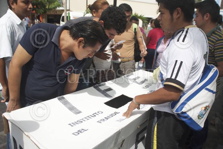 VILLAHERMOSA, TABASCO, 11JULIO2012.- Ciudadanos tabasqueños acuden a una urna denominada "Instituto del Fraude Electoral" en la cual aportan pruebas de la compra del voto que se realizo en la jornada electoral del primero de Julio. Lo anterior es en apoyo de Andrés Manuel López Obrador, quien lanzo un llamado a la población del país para poder revertir el proceso en el que resultara virtual presidente de México Enrique Peña Nieto. FOTO: MARCO POLO GUZMÁN HERNÁNDEZ/CUARTOSCURO.COM