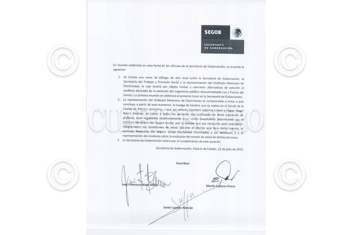 MÉXICO, D.F., 23JULIO2010.- Imagen del documento sobre el acuerdo de la Secretaria de Gobernación con el Sindicato Mexicano de Electricistas. FOTO: ESPECIAL/CUARTOSCURO.COM