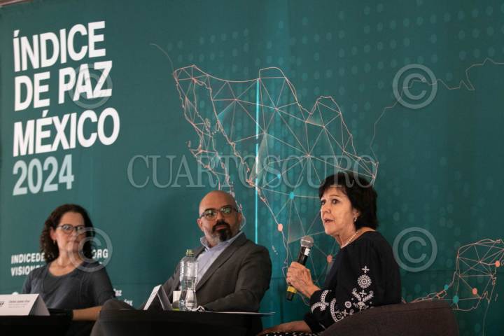 CIUDAD DE MÉXICO, 14MAYO2024.- Ana Paula Hernández Romano, coordinadora del Diálogo Nacional por la Paz; Carlos Juárez Cruz, director del Instituto para la Economía y La Paz; y Elena Azaola Garrido, investigadora del Centro de Investigaciones y Estudios Superiores de Antropología Social, presentaron el Índice de Paz México 2024. Los ponentes destacaron del informe que la tasa de homicidios se disparó un 71% en ocho años. FOTO: MOISÉS PABLO/CUARTOSCURO.COM