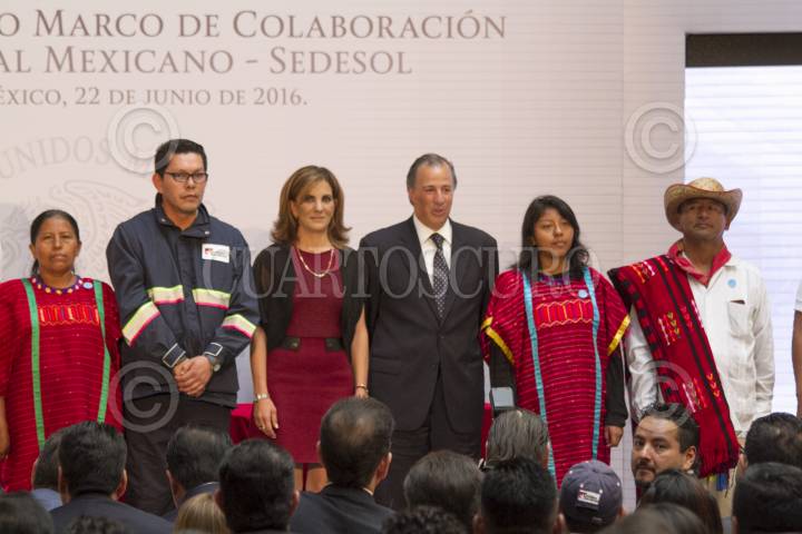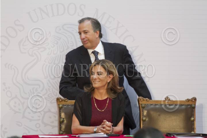 CIUDAD DE MÉXICO, 22JUNIO2016.- Elena Tanus Meouchi, directora general del Servicio Postal Mexicano (Sepomex), y José Antonio Meade, secretario de Desarrollo Social, encabezaron la firma del convenio marco de colaboración entre el Servicio Postal Mexicano y Sedesol, en el Palacio Postal. FOTO: MOISÉS PABLO /CUARTOSCURO.COM