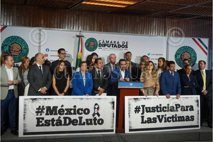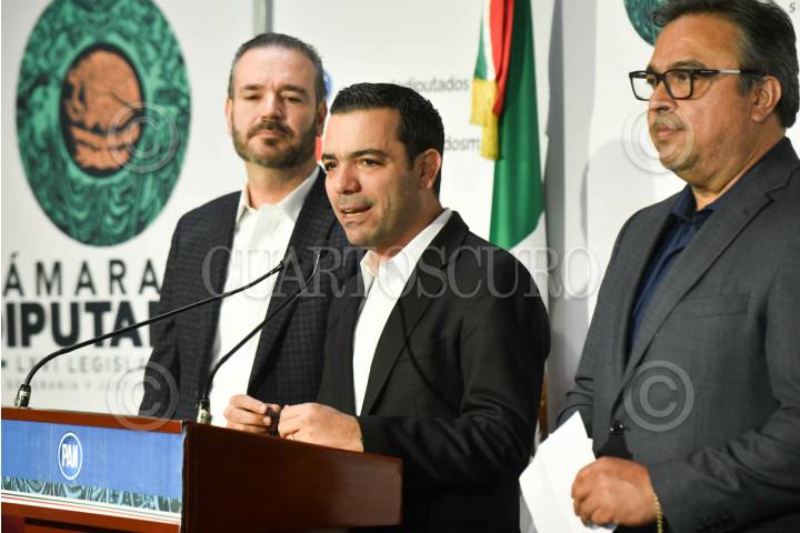 CIUDAD DE MÉXICO, 19MARZO2025.- Elías Lixa, coordinador del PAN, acompañado de diputados de la misma bancada, durante su participación en una conferencia de prensa en la Cámara de Diputados. FOTO: GRACIELA LÓPEZ/CUARTOSCURO.COM