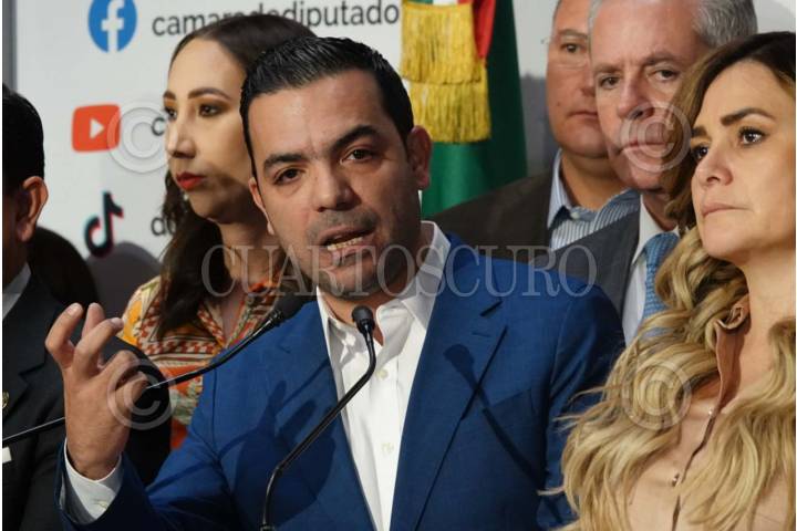 CIUDAD DE MÉXICO, 30JUNIO2025.- El diputado panista, Elías Lixa, encabezó la conferencia de prensa junto a sus compañeros legisladores, donde manifestó que votarán en contra de la reforma a las telecomunicaciones. FOTO: DANIEL AUGUSTO/ CUARTOSCURO.COM