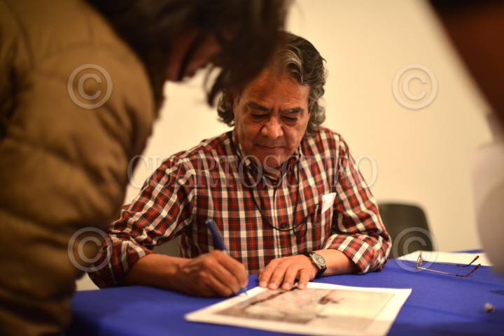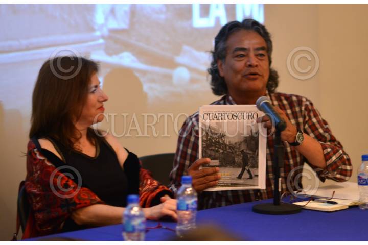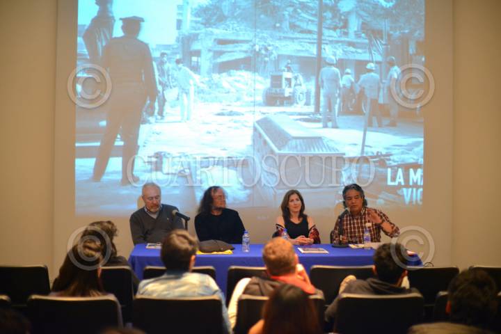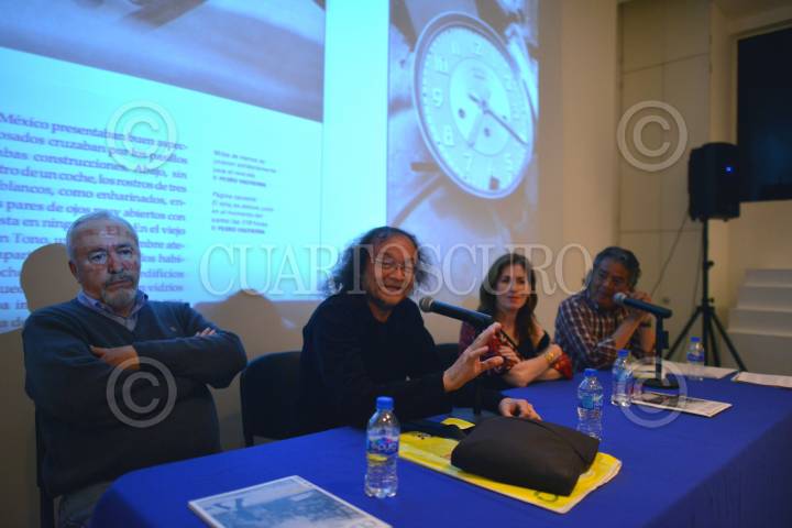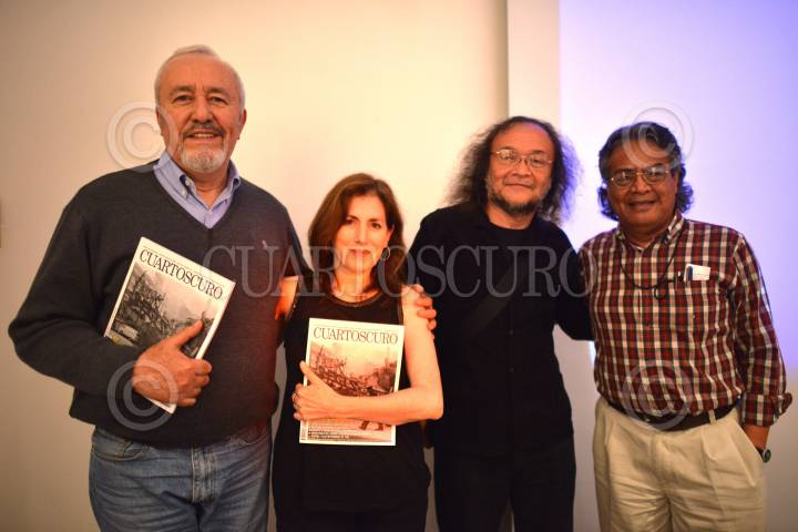 MÉXICO, D.F., 25SEPTIEMBRE2015.- Los periodistas Humberto Musaquio, Elisa Lozano, Víctor Roura y el fotoperiodista y director de la Agencia Cuartoscuro Pedro Valtierra, fueron los presentadores de la revista Cuartoscuro no. 133, realizado en el Museo de Arte Popular. Este número contiene una selección de fotografías de Pedro Valtierra sobre el sismo de 1985 ahora al cumplirse 30 años, un recuerdo del Primer Concurso de Cine Experimental y su alejamiento con el cine clásico y además, imágenes que rememoran los hechos del asalto al cuartel Madera por un grupo de jóvenes el 23 de septiembre de 1965. FOTO: ADOLFO VLADIMIR /CUARTOSCURO.COM