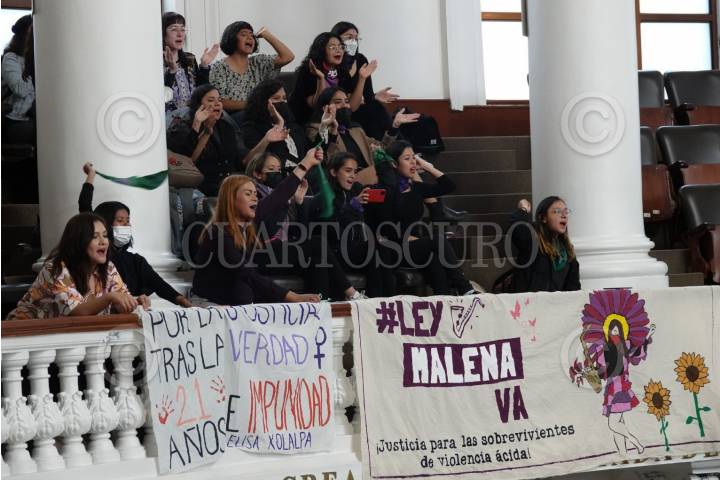 Colectivas feministas mostraron su apoyo a María Elena Ríos y a Elisa Xolalpa, víctimas de ataque de ácido, durante su participación en tribuna en la presentación de la iniciativa de la Ley Malena en el Congreso de la Ciudad de México