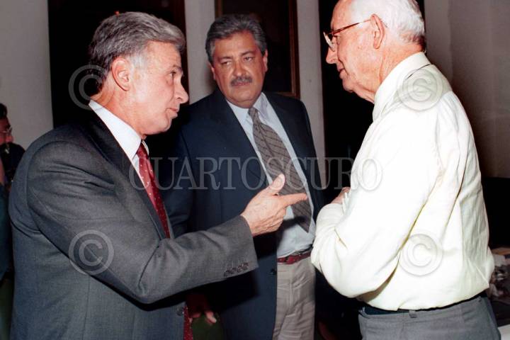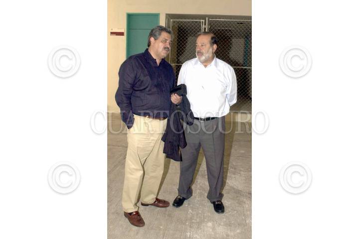 Rodolfo Elizondo, vocero de la Presidencia y el empresario Carlos Slim, conversan durante la visita al Hospital "Ruben Leñero" durante la gira del presidente Vicente Fox y Andrés Manuel Lopéz Obrador por la capital. FOTO:Oswaldo Ramírez/CUARTOSCURO.COM
