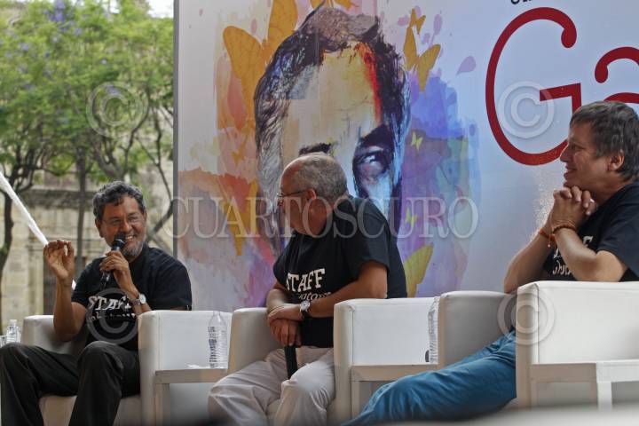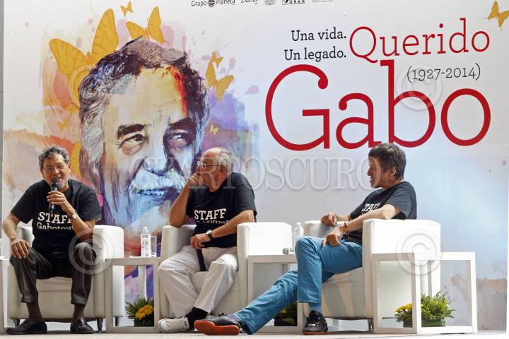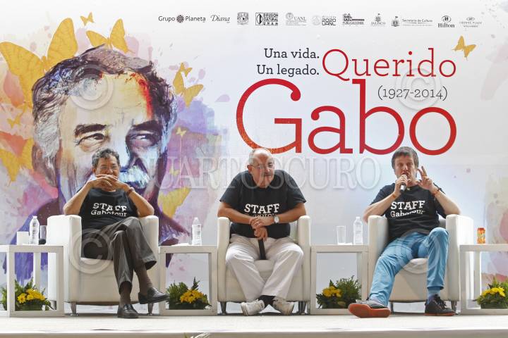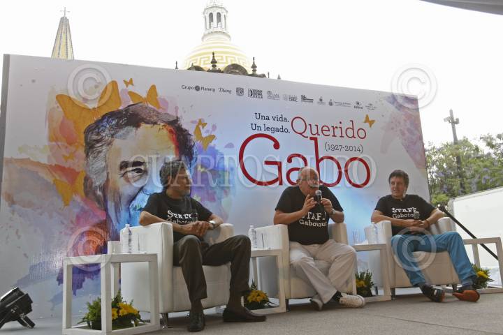 GUADALAJARA, JALISCO, 25ABRIL2015.-Elmer Mendoza, Benito Taibo y Xavier Velasco respectivamente, encabezaron una mesa de dialogo como homenaje dedicado al escritor Colombiano Gabriel García Márquez, evento que fue organizado por la Secretaria de Cultura del Estado y Editorial Grupo Planeta, mismo que se llevo a cabo en la Plaza de la Liberación. FOTO: FERNANDO CARRANZA GARCIA / CUARTOSCURO.COM