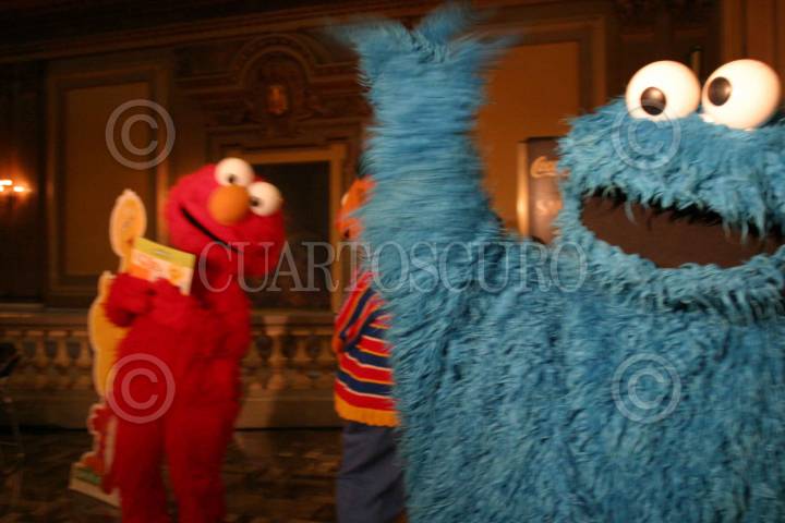 Elmo, Enrique y el moustro comegalletas, protagonistas de Plaza Sesamo durante la conferencia para dar a conocer el espectáculo "Todos Hacemos Música", que se presentará en el teatro Metropolitan a partir del miercoles 29. FOTO: Jua Pablo Zamora/CUARTOSCURO.COM