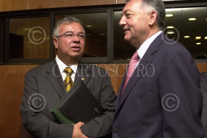 MEXDF21JULIO2004.- Los senadores priístas Cesar Camacho Solis y Ernesto Elorduy platican durante la sesión de la Comisión Permanente de la Cámara de Diputados. FOTO: Eunice Adorno/CUARTOSCURO.COM
