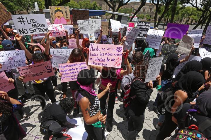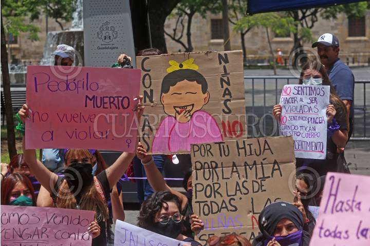 Mujeres feministas muestran cartulinas alusivas a la violencia contra la mujer, esto durante la concentración feminista denominada “Las Niñas no se Tocan” que se llevo a cabo a un costado de Palacio de Gobierno, los motivos pedir justicia por Elsy niña de 12 años de edad quien fue encontrada muerta con signos de violencia y abuso en días pasados en el municipio de Tala, así como por los acontecimientos pasados en Puerto Vallarta.