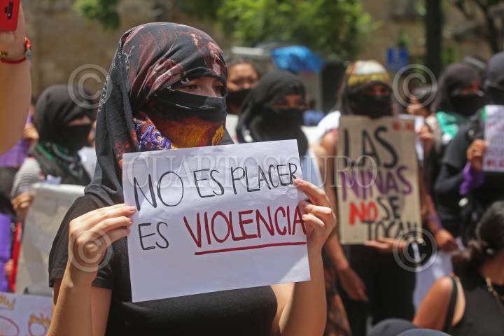 Mujer feminista muestra una cartulina alusivas a la violencia contra la mujer, esto durante la concentración feminista denominada “Las Niñas no se Tocan” que se llevo a cabo a un costado de Palacio de Gobierno, los motivos pedir justicia por Elsy niña de 12 años de edad quien fue encontrada muerta con signos de violencia y abuso en días pasados en el municipio de Tala, así como por los acontecimientos pasados en Puerto Vallarta.