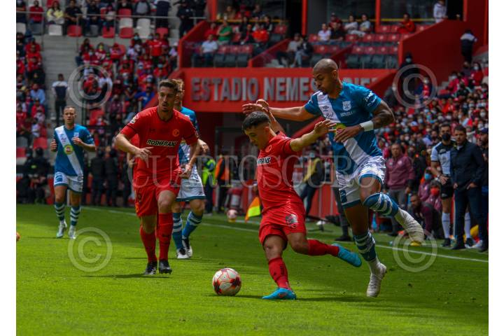 Leo Fernández medio de los Diablos de Toluca y Emanuel Gularte defensa de la Franja de Puebla durante el encuentro ante en el estadio Nemesio Diez.