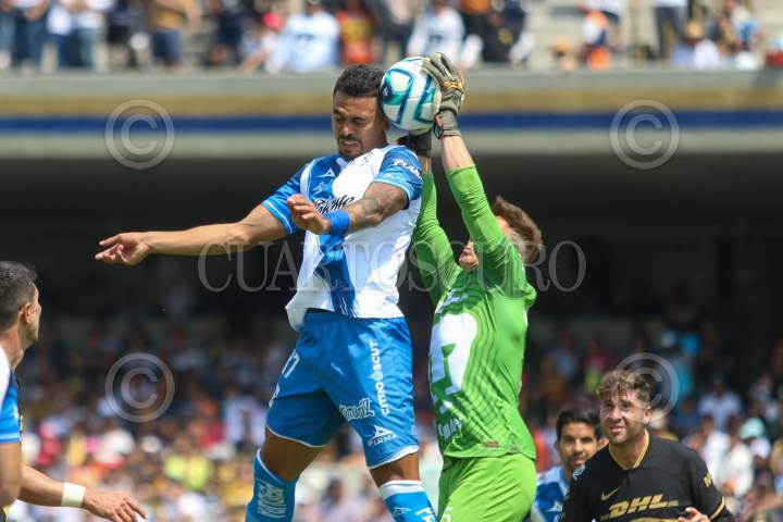 Emanuel Gularte del Puebla intenta rematar en el área chica, pero el portero de Pumas, Julio González, ataja el balón.