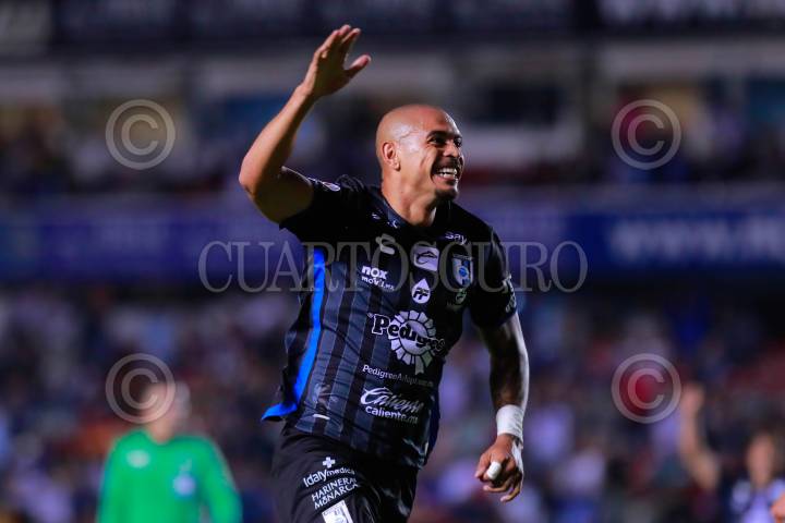 Emanuel Gularte del Querétaro celebra su gol durante el partido de la jornada 5 del Torneo Apertura 2023 de la Liga MX, en el estadio Corregidora.