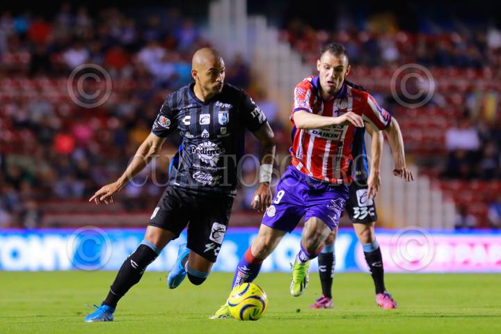 QUERÉTARO, QUERÉTARO, 27FEBRERO2024.- Emanuel Gularte del Queretaro y Leonardo Bonatini del San Luis durante el partido de la jornada 9 del Torneo Clausura 2024 de la Liga BBVA MX en el Estadio Corregidora. Los Gallos Blancos obtuvieron la victoria de 4-1. FOTO: CÉSAR GÓMEZ/CUARTOSCURO.COM