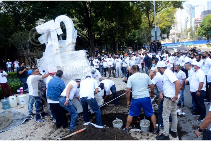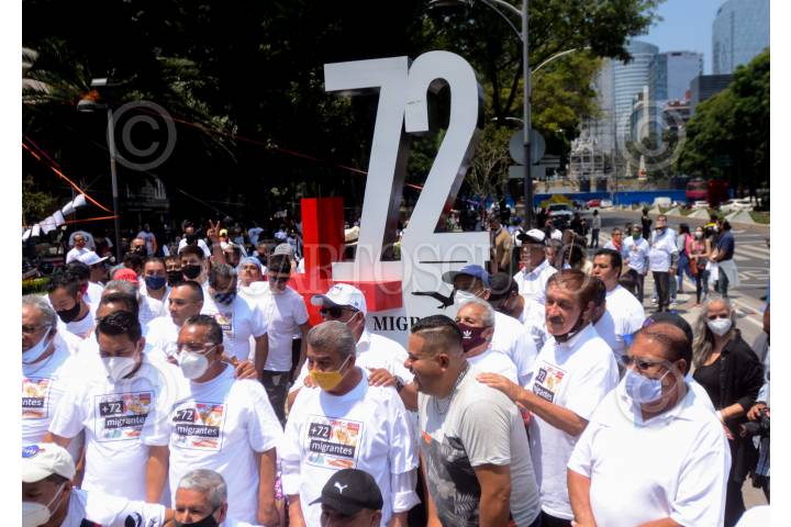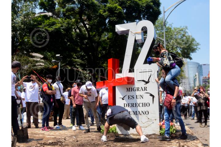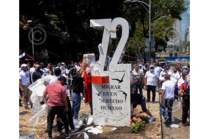 Integrantes del movimiento +72 realizó la colocación de un antimonumento frente a la embajada de Estados Unidos en conmemoración del décimo aniversario de la masacre de San Fernando, Tamaulipas, donde 58 hombres y 14 mujeres migrantes fueron asesinado