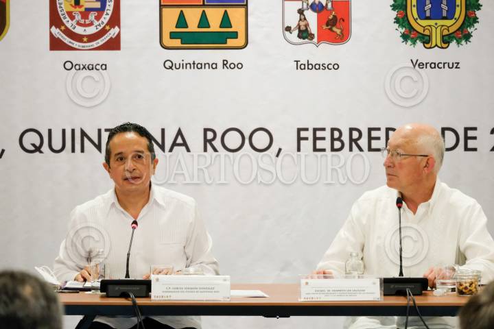 Ken Salazar, embajador de USA en México, y Carlos Joaquín González, gobernador de Quintana Roo, firmaron un convenio de colaboración con siete estados del país del sur, durante el Tercer Encuentro de Gobernadores del Sur Sureste con la Embajada de los Estados Unidos de América.