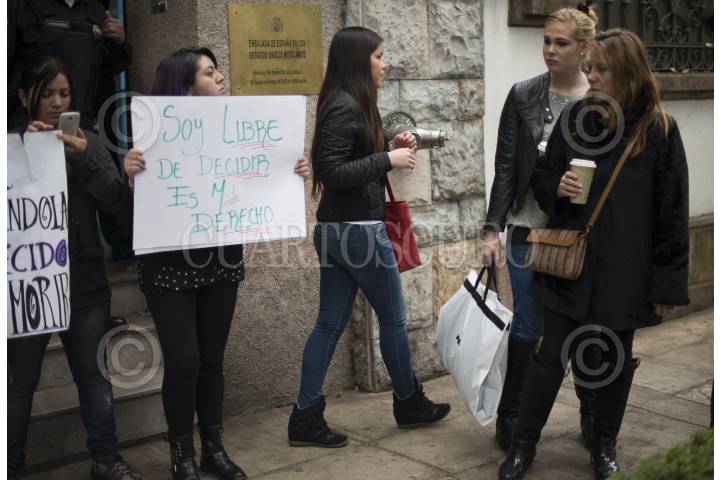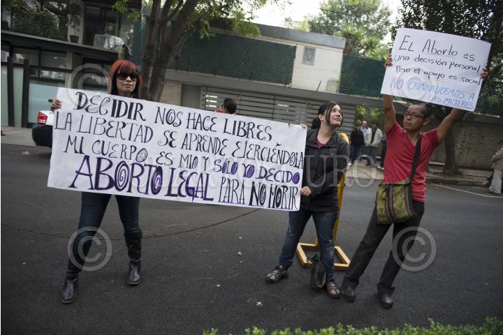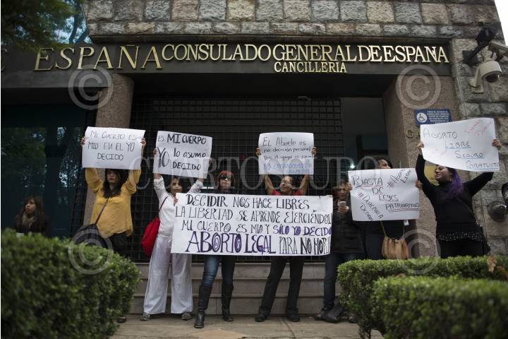 MÉXICO, D.F., 26DICIEMBRE2013.- Un grupo de mujeres se manifestaron a las afueras de la Embajada de España en México en protesta por la reforma a la Ley Orgánica de Protección de la Vida del Concebido y de los Derechos de la Mujer Embarazada en España, que endurece la intervención voluntaria del embarazo. La nueva ley elimina el derecho logrado por las mujeres a abortar en la sanidad pública en las primeras catorce semanas, además que el aborto solo se puede realizar en caso de que el riesgo para la salud de la mujer sea grave. FOTO: ADOLFO VLADIMIR /CUARTOSCURO.COM