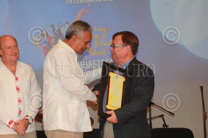 CIUDAD VALLES, SAN LUIS POTOSÍ, 07SEPTIEMBRE2017.- Durante la inauguración del Festival Internacional de Jazz Julián Santandreu se entregó el nombramiento de huésped distinguido al Embajador de Argentina en México, Daniel Chuburu, por parte del presidente municipal Jorge Terán. FOTO: MARCELO PALACIOS /CUARTOSCURO.COM