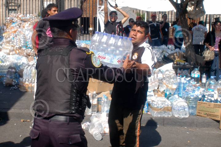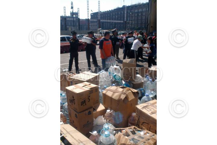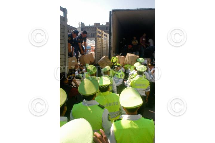 MÉXICO, D.F., 22ENERO2010.- Elementos de la Secretaria de Seguridad Publica del Distrito Federal descargan en el zócalo capitalino cuatro toneladas de agua embotellada que donaron para los damificados por el terremoto de Haiti. FOTO: LUIS CARBAYO/CUARTOSCURO.COM