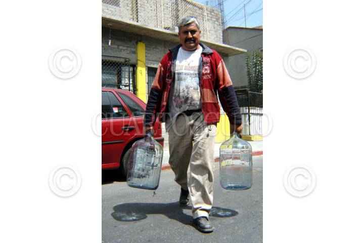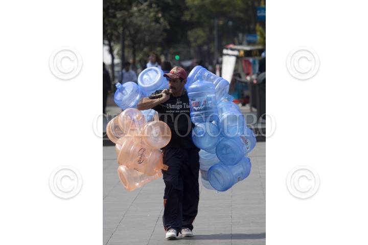 MÉXICO, D.F. 24ENERO2012.- Vendedor de agua camina con sus garrafones sobre la avenida Juárez. El agua envasada en garrafón es el 70% del mercado y crece a tasas de 7%, en tanto que la vendida en botella representa 30% del mercado total pero crece a tasas de 11%, según la Asociación Nacional de Productores y Distribuidores de Agua Purificada (ANPDAPAC),. FOTO: MOISÉS PABLO/CUARTOSCURO.COM
