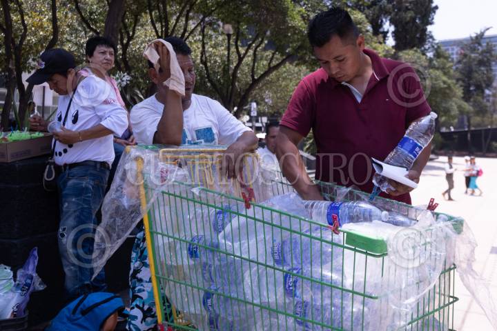 CIUDAD DE MÉXICO, 25MAYO2024. Vendedores de agua embotellada en las inmediaciones del Monumento a la Revolución ofrecen a los paseantes su producto durante la tercera ola de calor. FOTO: EDGAR NEGRETE LIRA/CUARTOSCURO.COM