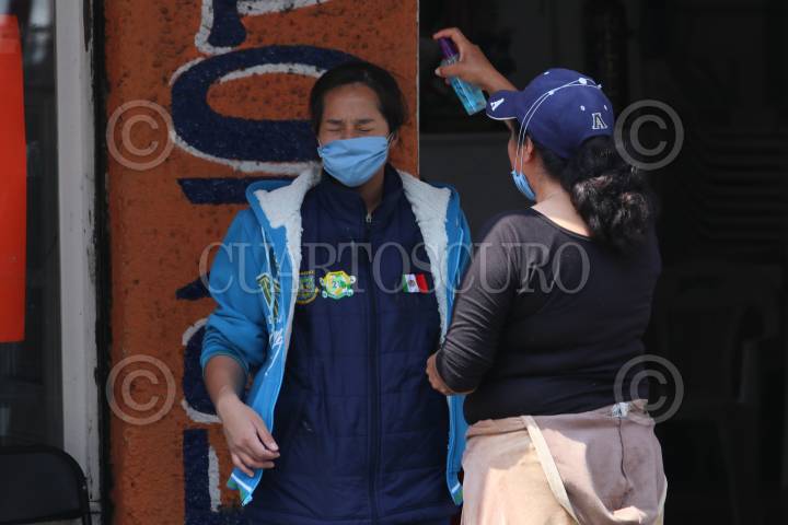Dos mujeres se sanitizan afuera del Hospital General Tláhuac