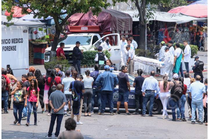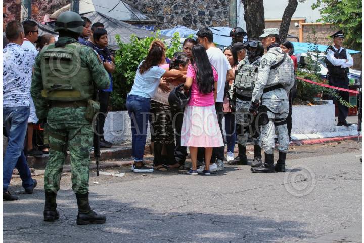 CUERNAVACA, MORELOS, 11JUNIO2024.- Decenas de personas observan el trabajo que realizan peritos e investigadores de la Fiscalía de Justicia del Estado en una escena de crimen donde dos comerciantes fueron atacados a balazos en el circuito del mercado Adolfo López Mateos. Los hechos ocurrieron después de las diez de la mañana cuando los hombres que viajaban en una camioneta de carga fueron atacados a balazos en la concurrida avenida por varios sujetos que despues de la agresion huyeron rumbo a la central de abastos. Policía de Cuernavaca, efectivos militares y de la Guardia Nacional resguardaron el sitio. Finalmente los cadáveres fueron levantados por personal del Servicio Médico Forense y trasladados a la morgue, en espera que sean reclamados por sus familiares. Estos dos homicidios se suman a otros tres registrados en la entidad; durante el amanecer fue localizado el cadáver de un hombre en una calle del municipio de Jiutepec y el cadáver desmembrado de otro hombre en una calle del municipio de Emiliano Zapata, además de un repartidor de tortillas abatido en el municipio de Puente de Ixtla. FOTO: MARGARITO PÉREZ RETANA/CUARTOSCURO.COM