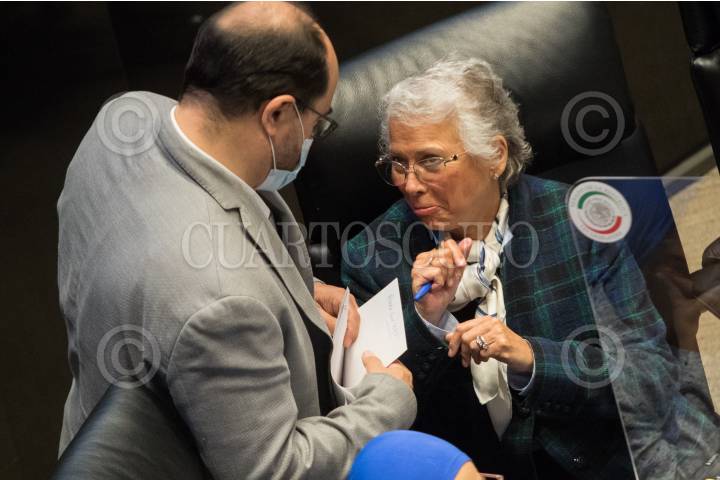 Emilio Álvarez Icaza conversa con Olga Sánchez Cordero durante la sesión en la Cámara de Senadores.