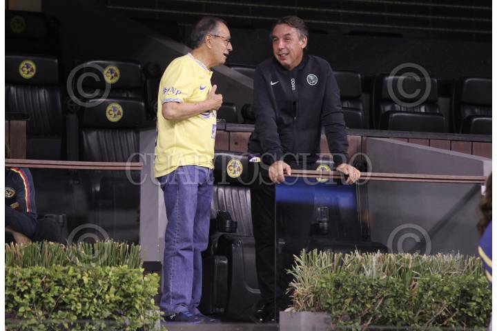 CIUDAD DE MÉXICO, 28MAYO2024. El ex futbolista Miguel Zelada Y Emilio Azcárraga durante el festejo del Club América en el Estadio Azteca, tras conseguir el bicampeonato del fútbol mexicano. FOTO: EDGAR NEGRETE LIRA/CUARTOSCURO.COM