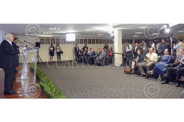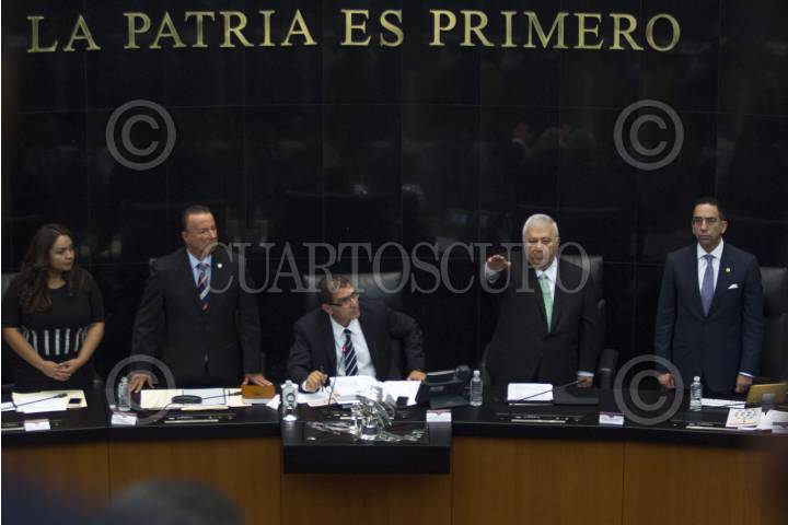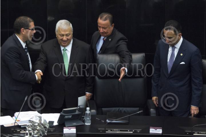 MÉXICO, D.F., 23JUNIO2015.- Armando Rios Peter senador del PRD junto a Emilio Chuayffet Chemor, Secretario de Educación Pública; Aarón Irízar López, senador del PRI y Javier Lozano senador del PAN durante la comparecencia en la Cuarta Reunion Ordinaria de la Segunda Comisión de la Comisión Permanente Relaciones Exteriores, Defensa Nacional y Educación dentro del edificio del Senado de la República. FOTO: ENRIQUE ORDÓÑEZ /CUARTOSCURO.COM