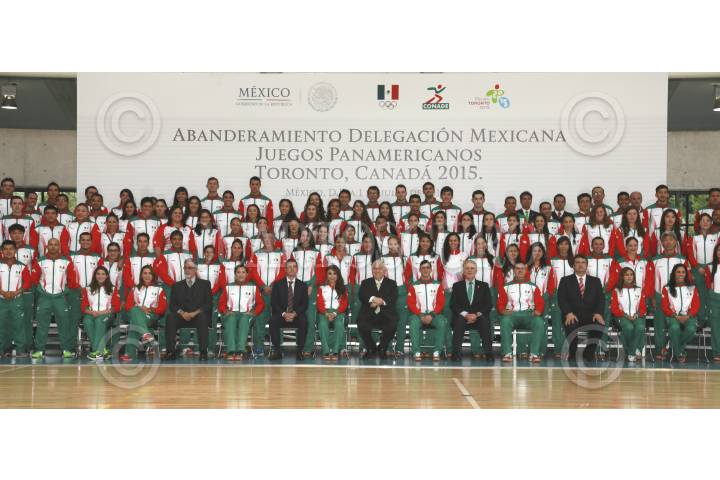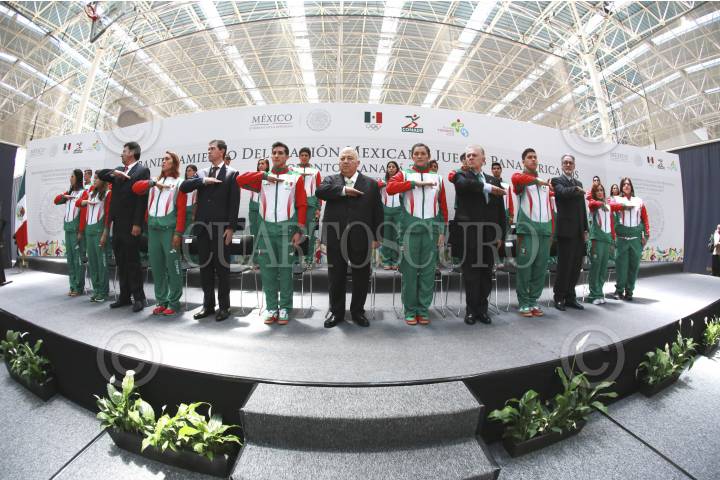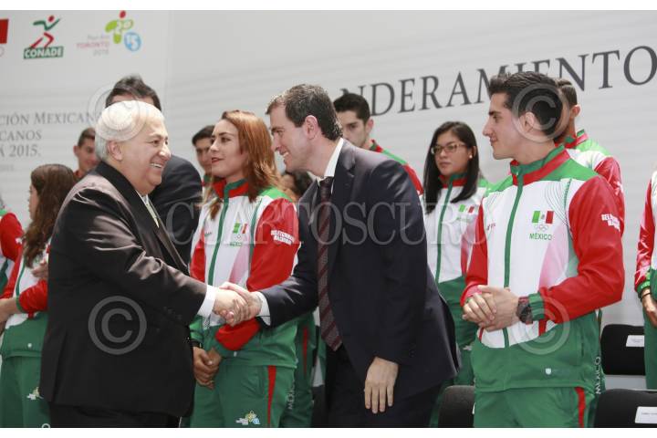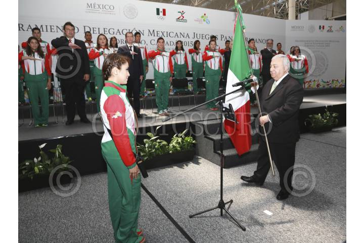 MÉXICO, D.F., 01JULIO2015.- Emilio Chuayffet, secretario de Educación Pública, abanderó a la delegación nacional que participará en los XVII Juegos Panamericanos a celebrarse en Toronto, Canadá, la encargada de recibir la bandera nacional fue la raquetbolista Paola Longoria. FOTO: SEP /CUARTOSCURO.COM