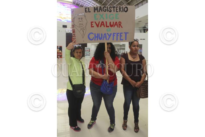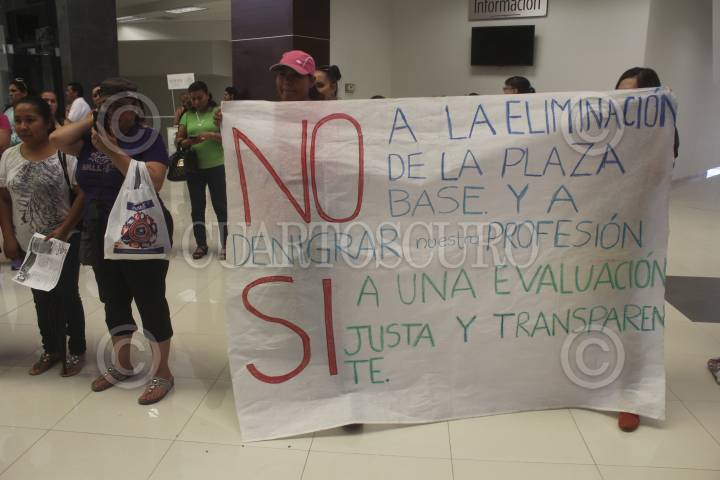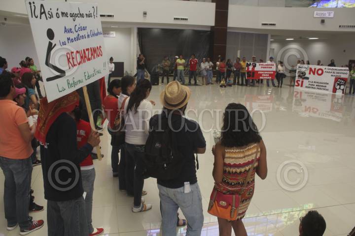 CIUDAD JUÁREZ, CHIHUAHUA, 06JULIO2015.- Con banderas, pancartas y equipo de sonido, maestros e integrantes del grupo Resissste llevaron nuevamente sus manifestaciones en contra de la "reforma educativa" al edificio administrativo de gobierno del estado. Los docentes que acudieron a manifestarse aseguraron ser víctimas de acoso laboral de parte de los inspectores por participar en el movimiento, por lo que exigieron hacer un alto al mismo. Así mismo, apuntaron que no están en contra de la evaluación que propone dicha reforma, sino de la separación de la plaza docente que contempla en caso de no aprobar la misma, asegurando que ésta medida viola sus derechos humanos y es punitiva. FOTO: NACHO RUIZ /CUARTOSCURO.COM