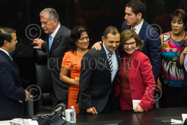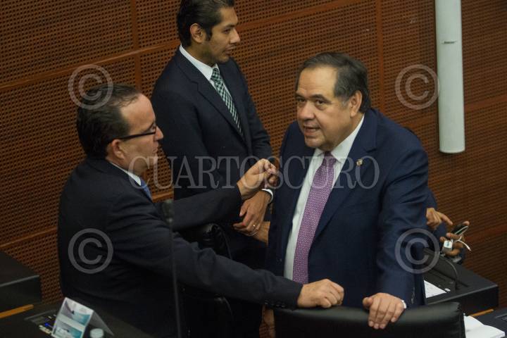 CIUDAD DE MÉXICO, 26OCTUBRE2017.- Emilio Gamboa Patrón, coordinador de los senadores del PRI, felicita a Raúl Aarón Pozos Lanz, luego de la aprobación de los cambios y adicciones de las reformas a la Ley de Telecomunicaciones y Radiodifusión, en la sesión de la Cámara de Senadores. FOTO: MOISÉS PABLO /CUARTOSCURO.COM