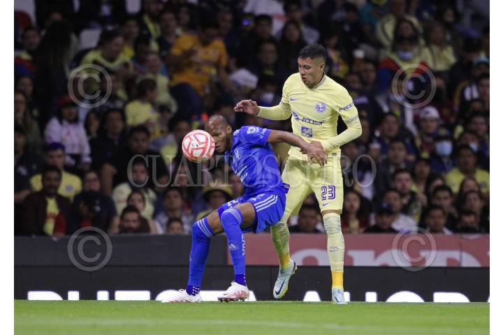 Luis Quiñones de Tigres disputa una pelota con Emilio Lara de las Águilas durante el partido de fútbol América vs Tigres correspondiente a la jornada 12 del Torneo Apertura 2022 de Liga BBVA MX, en el estadio Azteca.