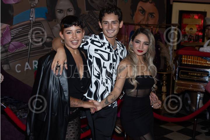 CIUDAD DE MÉXICO, 20JUNIO2024. Romina Marcos junto a su hermano Emilio Osorio y su novia Leslie Gallardo a su paso por la alfombra roja de la puesta en escena "Aventurera", en su noche de estreno en el Salón Los Ángeles. FOTO: EDGAR NEGRETE LIRA/CUARTOSCURO.COM