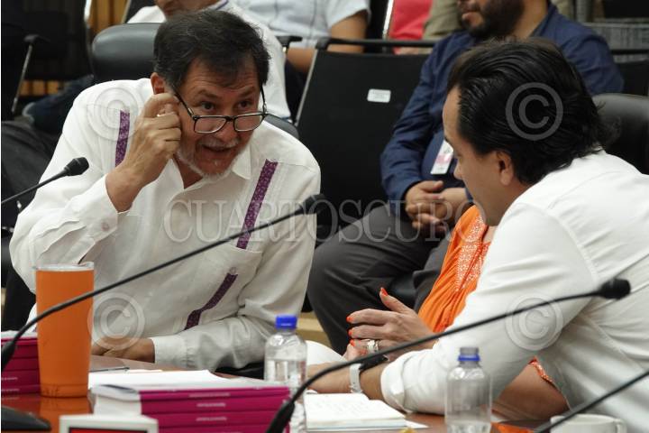 CIUDAD DE MÉXICO, 07JUNIO2024.- José Gerardo Fernandez Noroña, consejero del poder legislativo por el Partido del Trabajo (PT), conversa con Emilio Suárez Lino, representante del Partido Revolucionario Institucional (PRI), durante la sesión ordinaria del Instituto Nacional Electoral (INE). FOTO: GALO CAÑAS/CUARTOSCURO.COM