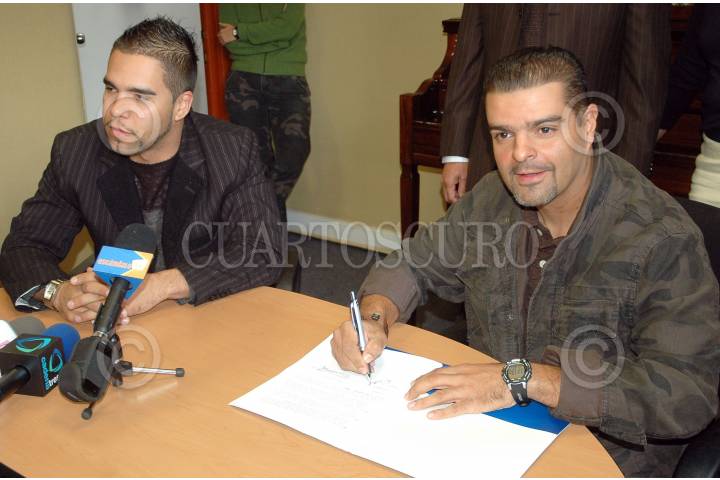 MÉXICO D.F., 18ENERO2008.- Emir Pabon y Humberto Pabon Jr. integrantes del grupo CañaReal durante la firma de contrato de exlusividad con la disquera Universal Music. FOTO: RODOLFO ANGULO/CUARTOSCURO.COM