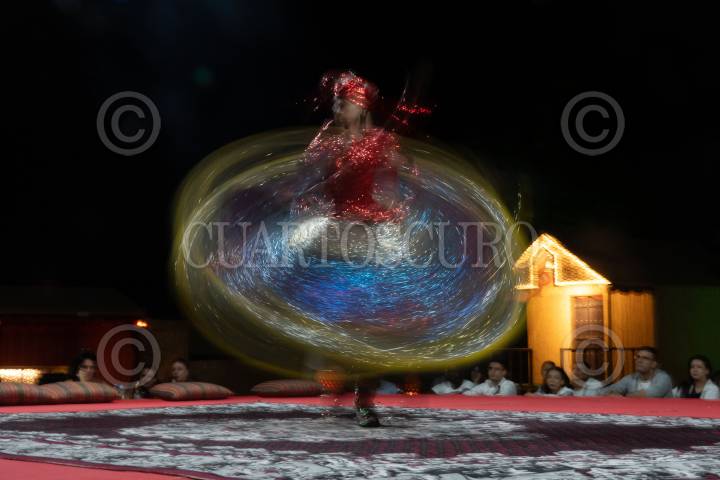 RUB AL-JALI, EMIRATOS ÁRABES UNIDOS, 18NOVIEMBRE2023.- Un bailarín presenta su show en el campamento para turistas instalado en el desierto Rub-Al-Jali. FOTO: GRACIELA LÓPEZ /CUARTOSCURO.COM