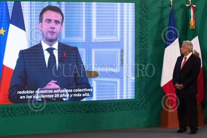 Emmanuel Macron, presidente de Francia, ofreció un mensaje virtual, con motivo de la inauguración del Foro Generación Igualdad. En la imagen se aprecia a Andrés Manuel López Obrador, Presidente de México.
