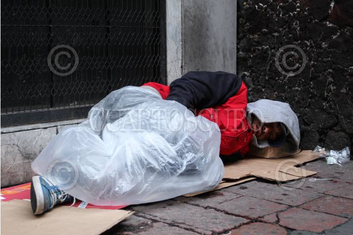 MÉXICO, D.F., 30SEPTIEMBRE2015.- Un hombre duerme en una de la aceras del centro histórico, resguardándose del frio con bolsas de plástico y cartones. FOTO: ISABEL MATEOS /CUARTOSCURO.COM