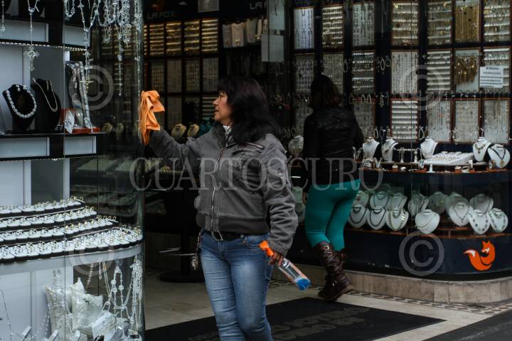 MÉXICO, D.F., 30SEPTIEMBRE2015.- Dos mujeres limpian la vitrina de una de las joyerías del centro joyero en el centro histórico. FOTO: ISABEL MATEOS /CUARTOSCURO.COM