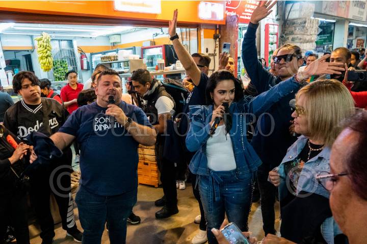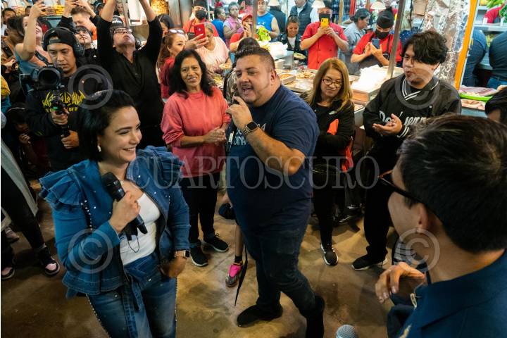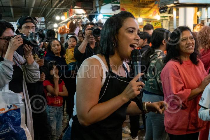 Johanna Betancourt García de la Sonora Dinamita durante la activación "De Empresas me echo un taco" en la Central de Abastos.
