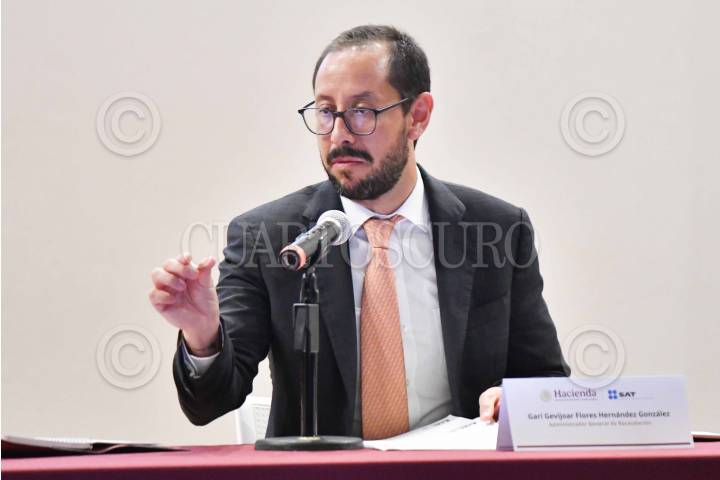 CIUDAD DE MÉXICO, 13MARZO2025.- Gari Gevijoar Hernández, administrador General de Recaudación, durante su intervención en la conferencia de prensa en la que se compartió información general del proceso de declaración anual 2024 para empresas, el cual tiene como plazo máximo el próximo 31 de marzo. FOTO: MARIO JASSO/CUARTOSCURO.COM