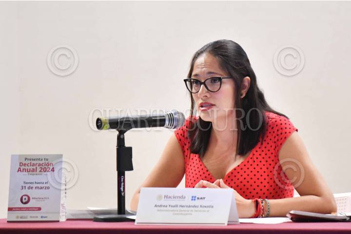 CIUDAD DE MÉXICO, 13MARZO2025.- Andrea Yoalli Hernández, administradora general de Servicios al Contribuyente, durante su intervención en la conferencia de prensa en la que se compartió información general del proceso de declaración anual 2024 para empresas, el cual tiene como plazo máximo el próximo 31 de marzo. FOTO: MARIO JASSO/CUARTOSCURO.COM