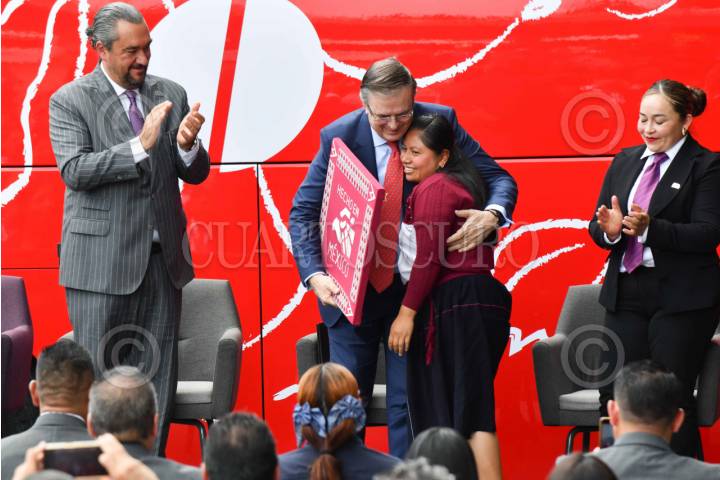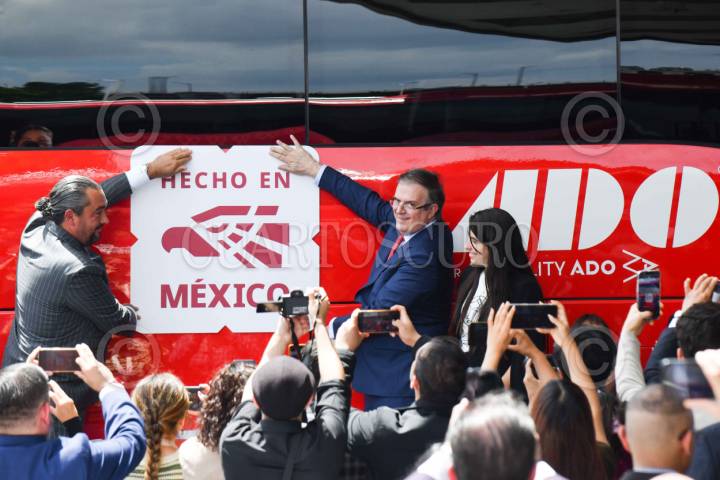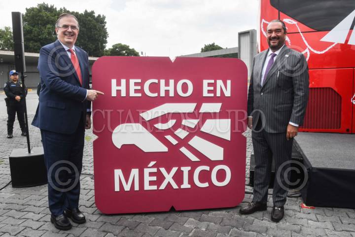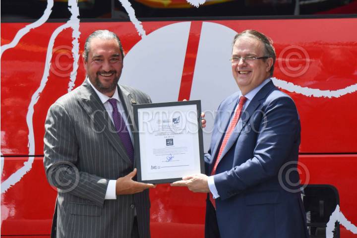 CIUDAD DE MÉXICO, 08JULIO2025.- José Antonio Pérez Anton, director general de Autobuses de Oriente (ADO) y Marcelo Ebrard, secretario de Economía, durante el evento protocolario en donde la empresa MOBILITY ADO recibió el Sello "Hecho en México" por parte de la iniciativa de la Secretaría de Economía que busca impulsar la producción nacional y promover el uso de dicho distintivo. FOTO: MARIO JASSO/CUARTOSCURO.COM